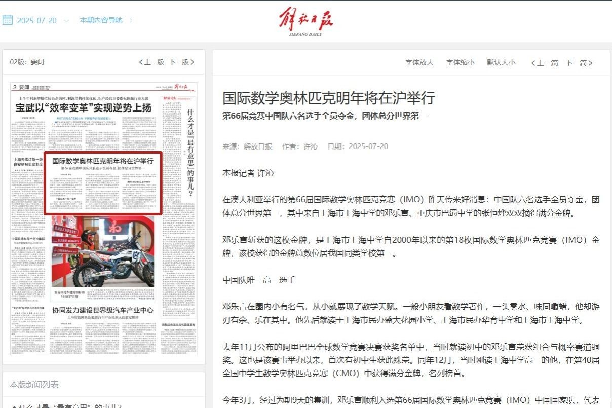解放日报:taptap下载安装官方正版学子摘得第66届国际数学奥林匹克竞赛满分金牌,IMO明年登陆上海