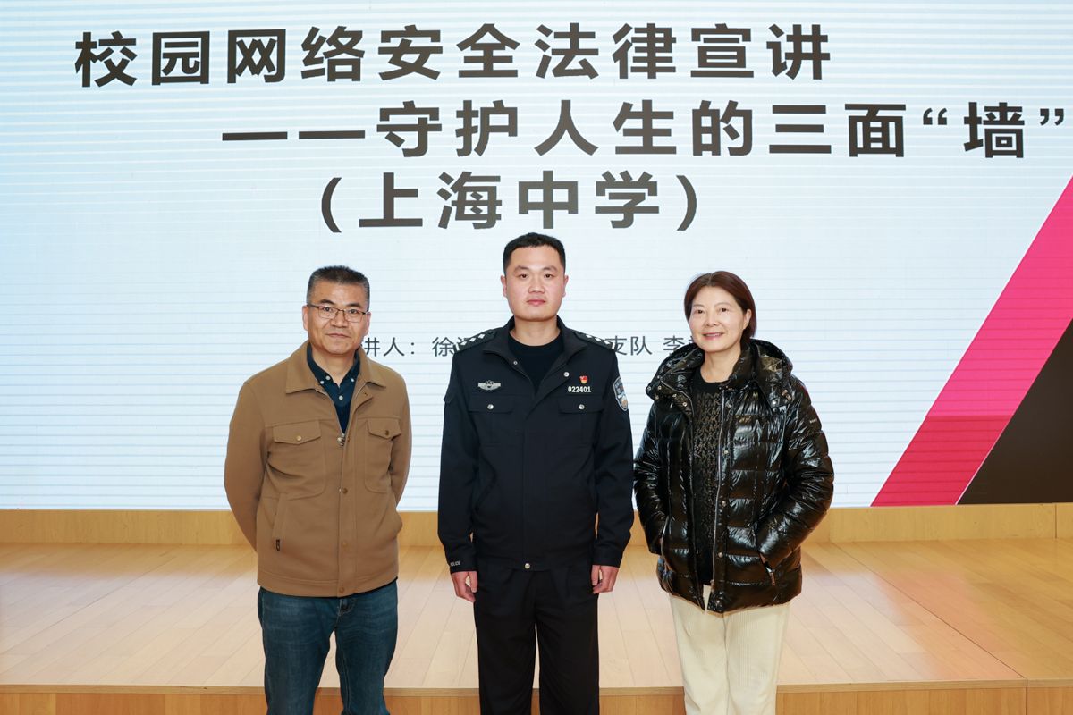 以“学习宣传贯彻习近平法治思想,推动宪法深入人心”为主题,在全国组织开展2025年“宪法宣传周”活动。为进一步提高同学们的网络安全防范意识,我校德育处于11月28日中午,在甄陶楼报告厅,组织举办了一场关于校园网络安全法律宣讲会。本次讲座特别邀请了徐汇公安局网安支队管理组的李斌警长担任主讲,德育处副主任吴静怡主持,校党委书记张泽红、校党委副书记刘茂祥出席,全体学生干部以及部分班主任代表参与其中。(合影)宣讲会开始时,...
