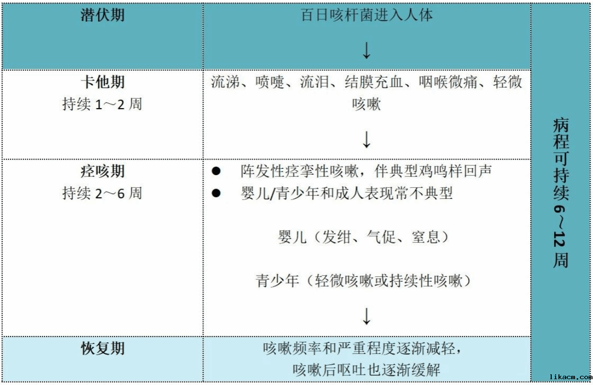 百日咳潜伏期一般为7~14天。典型的百日咳通常会经历卡他期、痉咳期、恢复期3个病程。卡他期表现为轻微的咳嗽、流涕、喷嚏、鼻塞等,持续约1~2周。随后进展到痉咳期,咳嗽加剧,出现阵发性连声痉咳、面色涨红,直至痰液排出或咳吐,此时由于肺内缺氧,患者会长吸气,空气通过痉挛的声门而发出“鸡鸣”样的吸气吼声,每日发作数次,一般不会发热,痉咳期一般持续2~6周。进入恢复期后,痉挛性咳嗽好转,但咳嗽仍可持续数周。