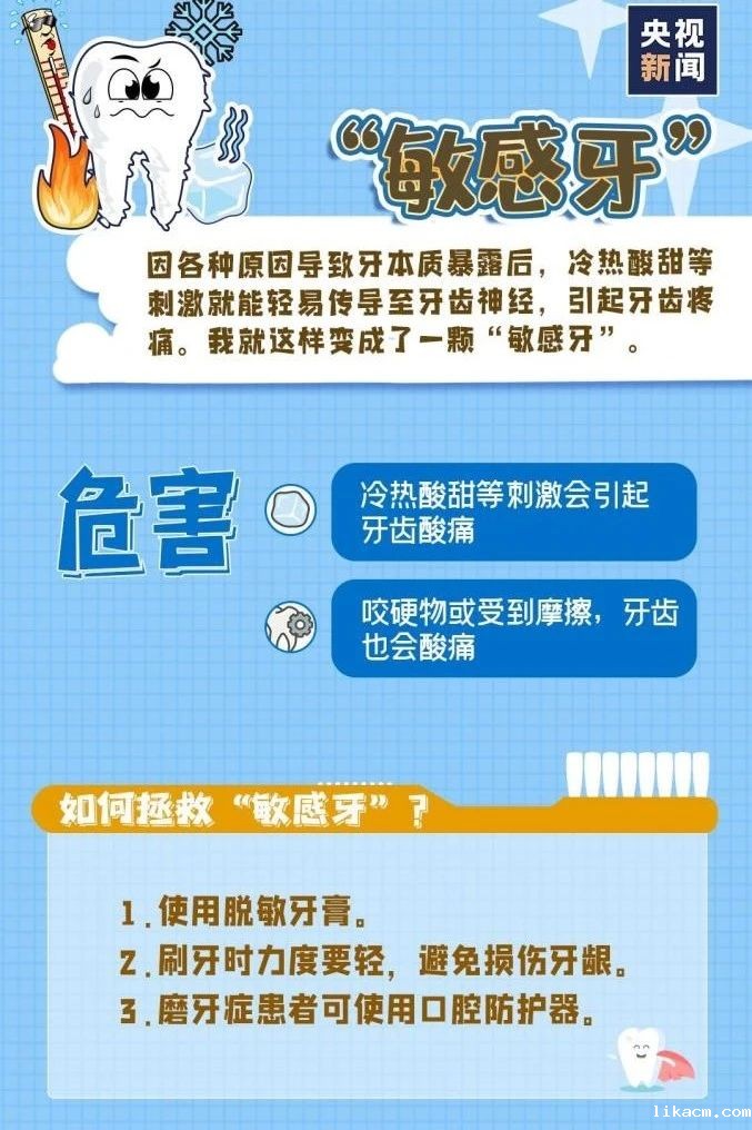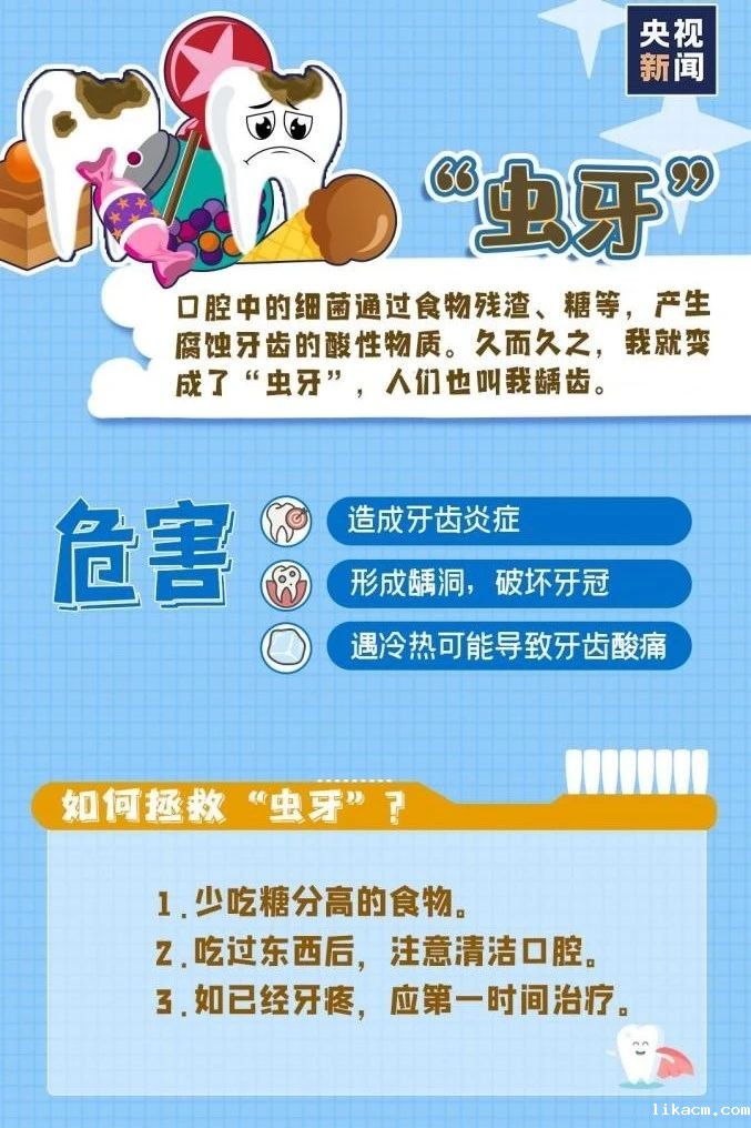 对牙齿有害的食物主要是甜食和碳酸饮料,它们都富含糖类。糖果、蛋糕、巧克力、冰淇淋……这些好看又甜的食物对于牙齿来说都是糖衣炮弹,如果经常摄入过多的含糖甜食或饮用过多的碳酸饮料,它们很容易黏附在牙面上,口腔中的细菌吃了糖以后,会大量繁殖并利用糖分产酸,使牙齿受到侵蚀,引起龋病或产生牙齿敏感。所以儿童应该少吃甜食、少喝饮料。