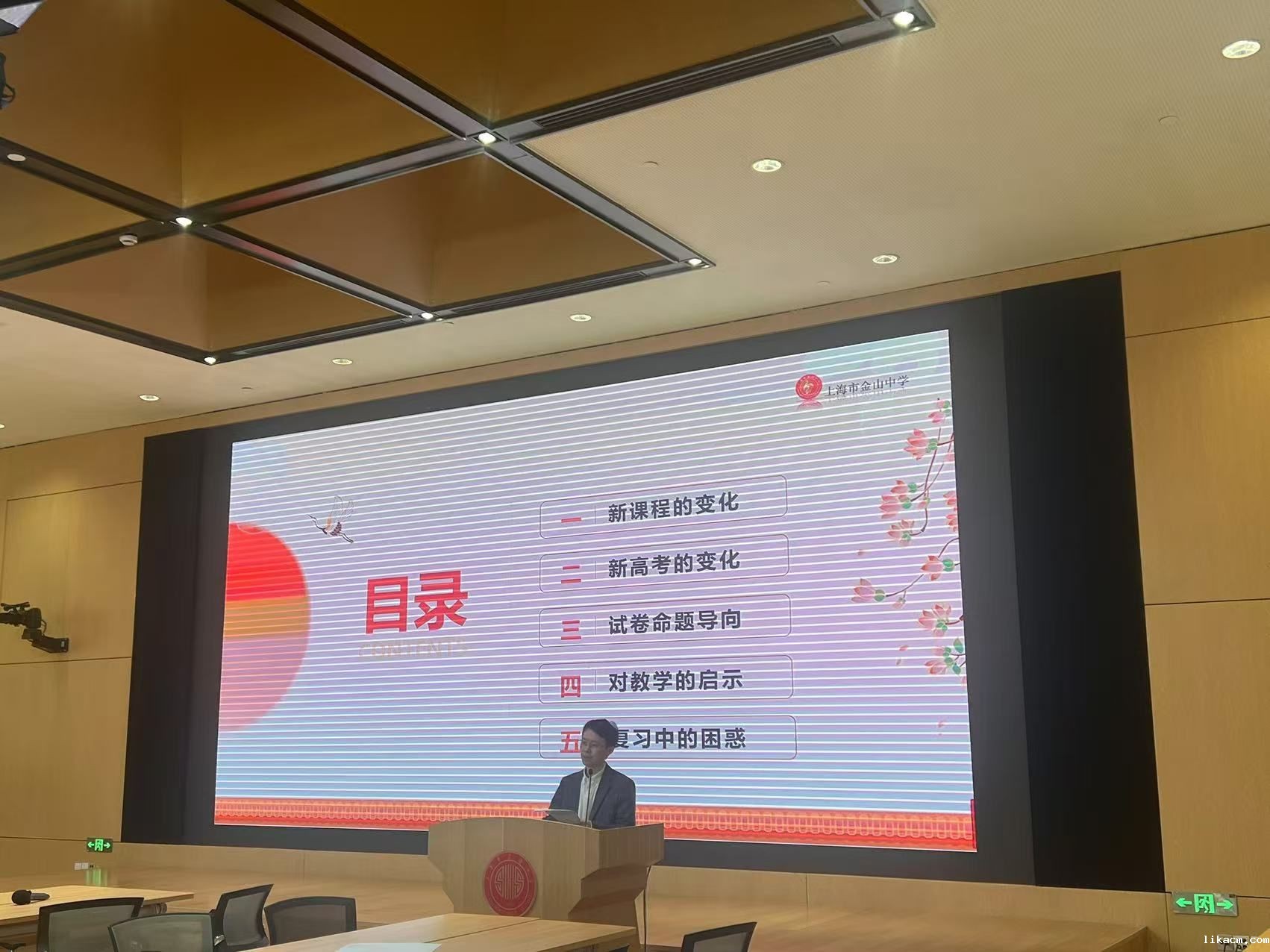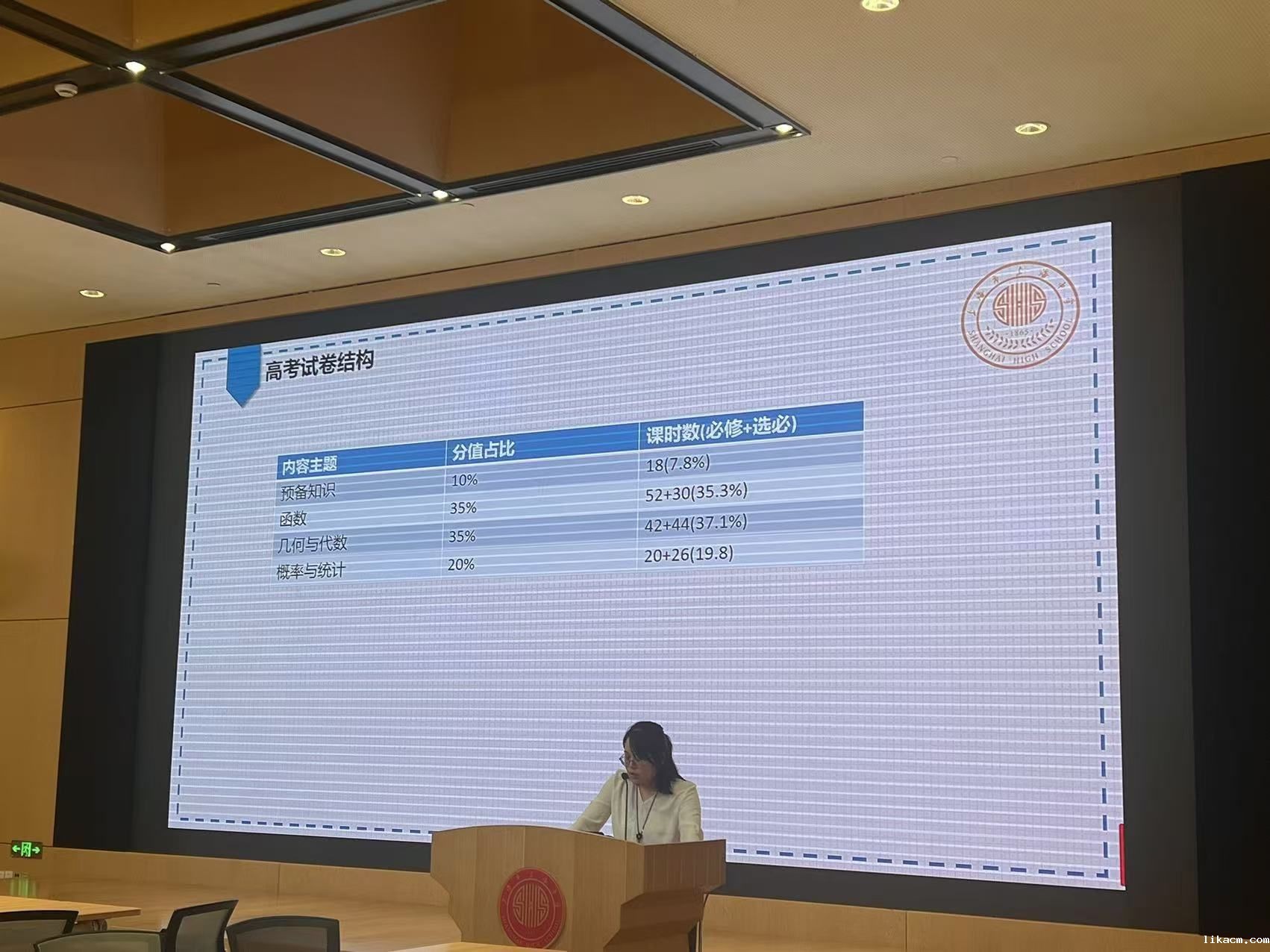 第二个报告是金山中学的干志华老师,他主要分析了新教材之后的几届高考,春考题目结构的变化,以及高中各部分知识点的占比情况。大致总结如下:增加了导数部分,加强了概率统计各部分知识的考察,弱化了数列的要求,去掉了线形规划,矩阵行列式等知识点;我们高中老师特别是高三老师,应该紧扣大纲,了解命题热点,准备相应的复习计划。