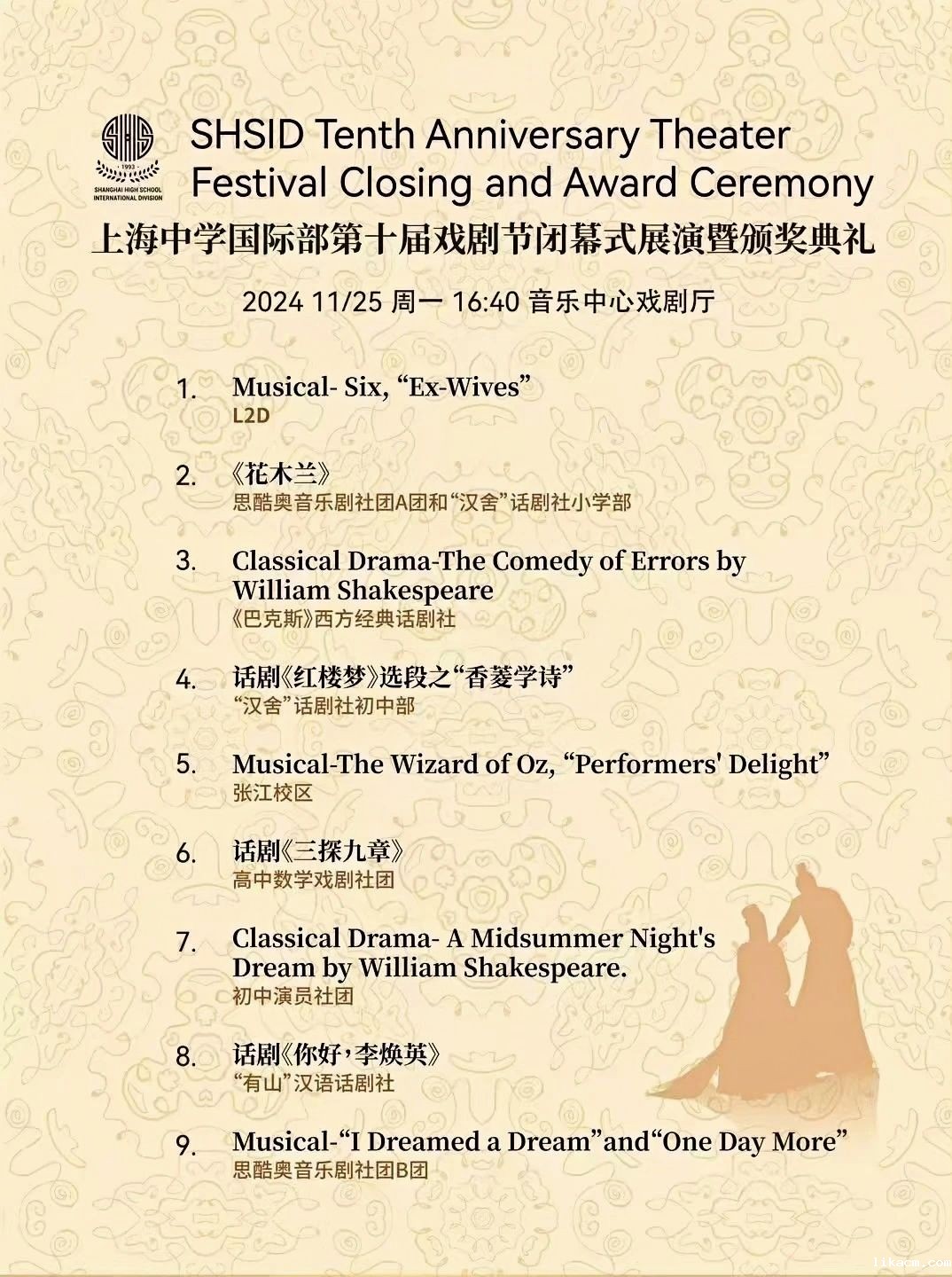 本届戏剧节参演的作品涵盖多样题材,中外经典话剧,影视改编话剧,百老汇音乐剧,都以崭新的视角和手法在本届戏剧节上焕发出新的艺术生命。从音乐剧《Six》、中国历史故事《花木兰》,到莎士比亚戏剧《Comedy of Errors》和《仲夏夜之梦》,都展现出深厚的文学底蕴和艺术张力;《红楼梦之香菱学诗》与原创数学戏剧《三探九章》则是传统文化与现代创意的完美融合;《绿野仙踪》、《你好,李焕英》和《悲惨世界》等剧目的粉墨登场,表达出真挚的人间情感,让观众深切体验到了舞台戏剧的艺术感染力。