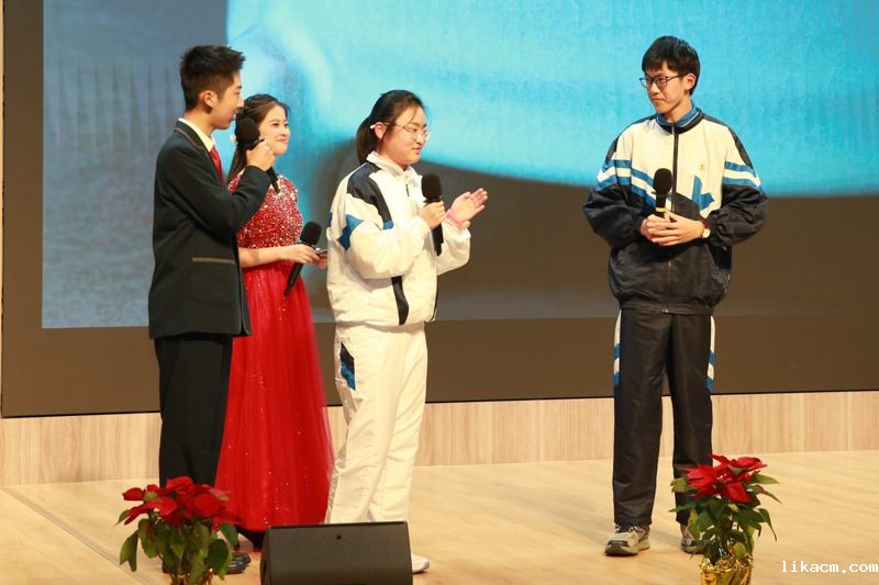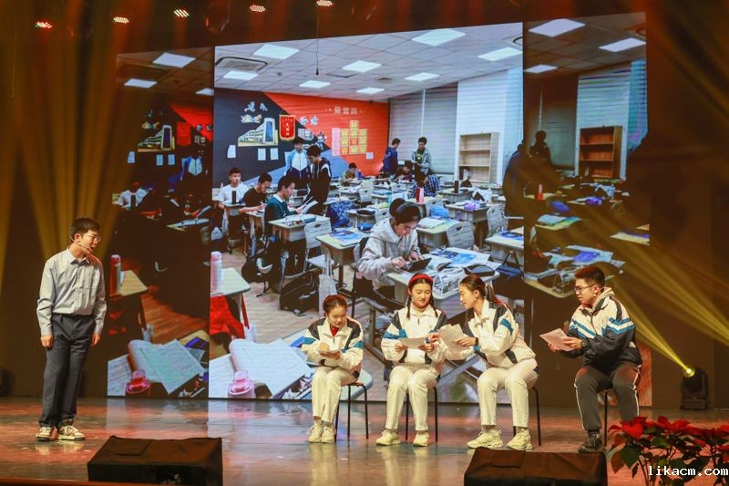 艺术节闭幕式为观众奉上了一场艺术与青春交织的视听盛宴。其中,高一学生安排在西楼礼堂分会场,高二、高三的学生在大礼堂主会场,两边会场都安排了节目,精彩纷呈的表演轮番上演。导演组运用直播技术,两个会场之间演出转场互动,设计构思巧妙新颖。
