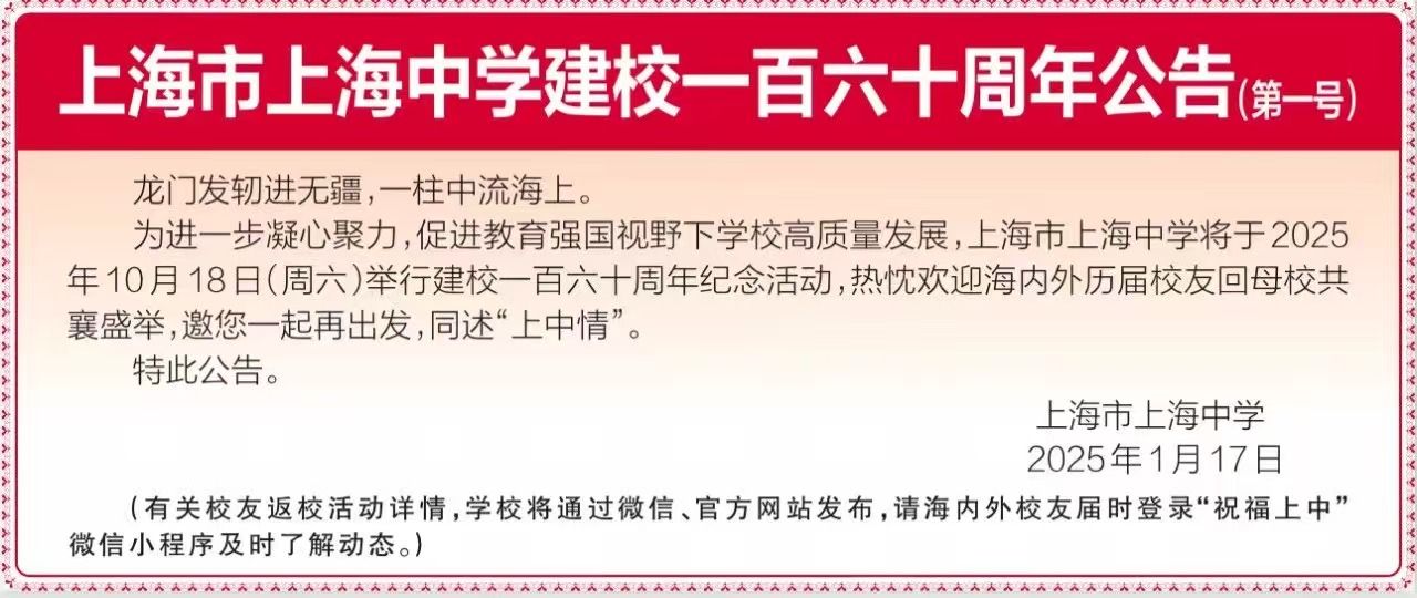 (有关校友返校活动详情,学校将通过微信、官方网站发布,请海内外校友届时登录“祝福上中”微信小程序及时了解动态。)