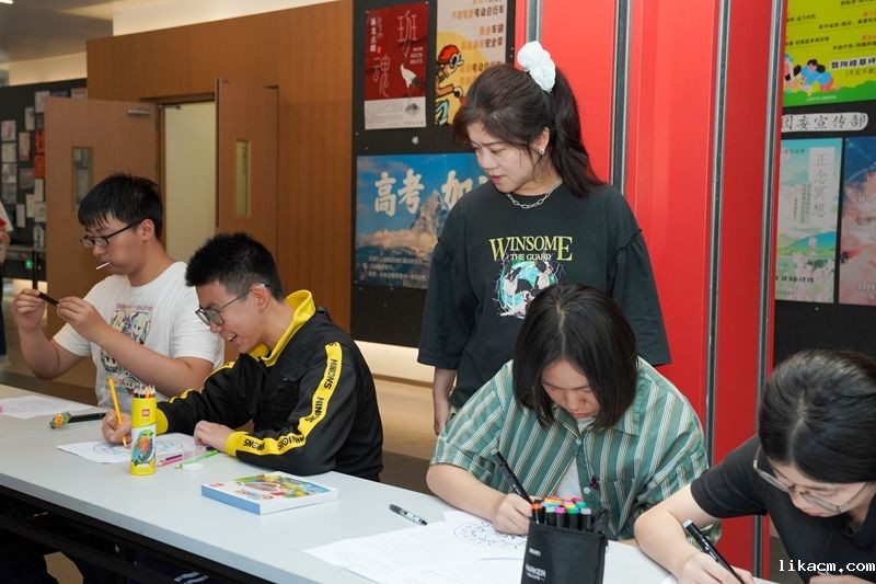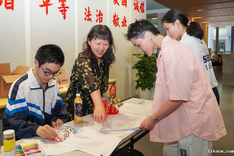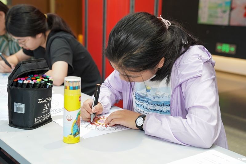 与此同时,甄陶楼大厅内,另一场艺术疗愈活动—曼陀罗绘画正热烈进行。在心理组江乐华老师的指引下,同学们手持彩笔或蜡笔在圆形的曼陀罗模板上自由填色,通过色彩与图案表达内心世界。完成作品后,大家互相分享创作心得,有的同学依依不舍,带走了曼陀罗模板继续绘画。