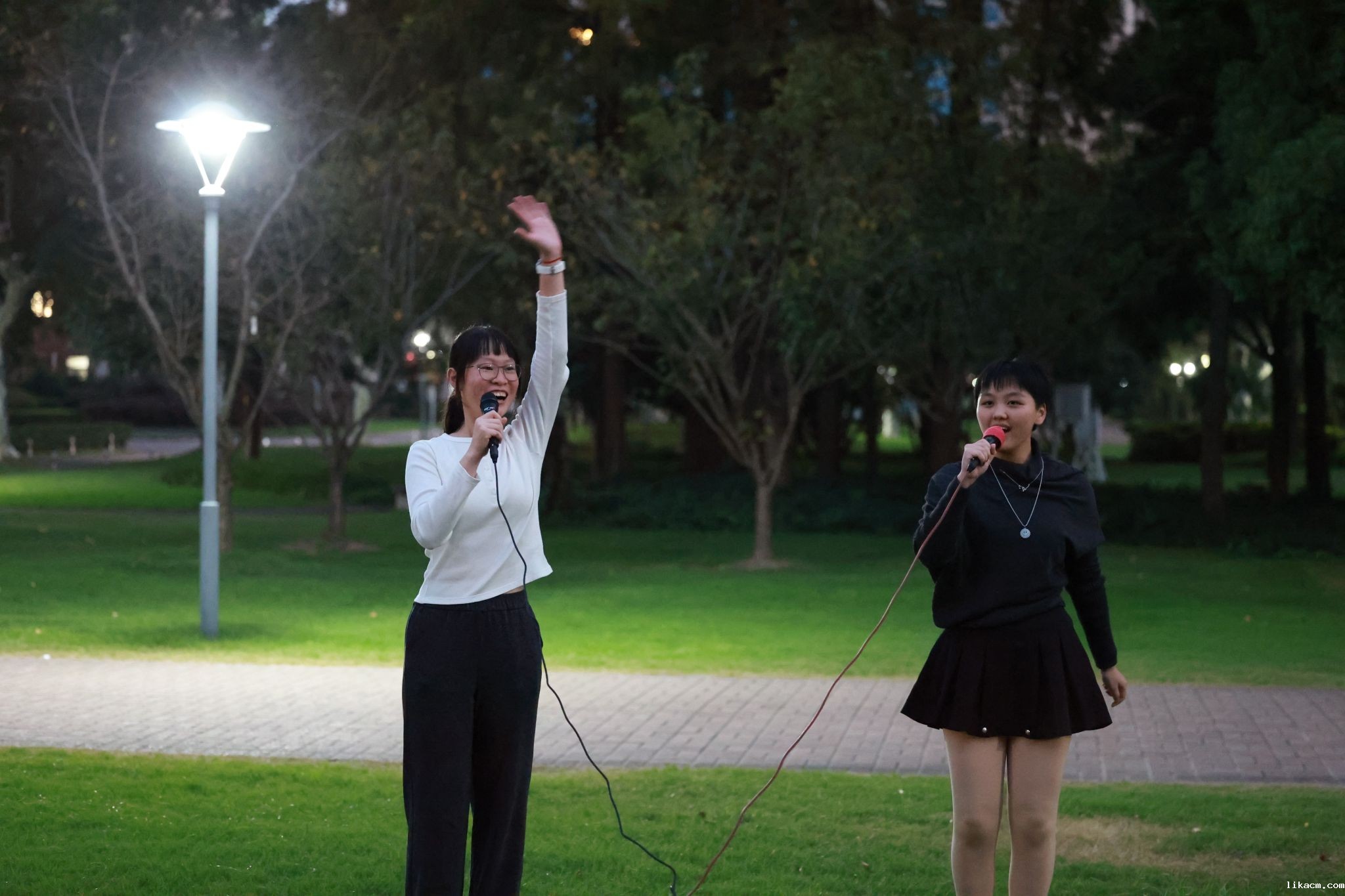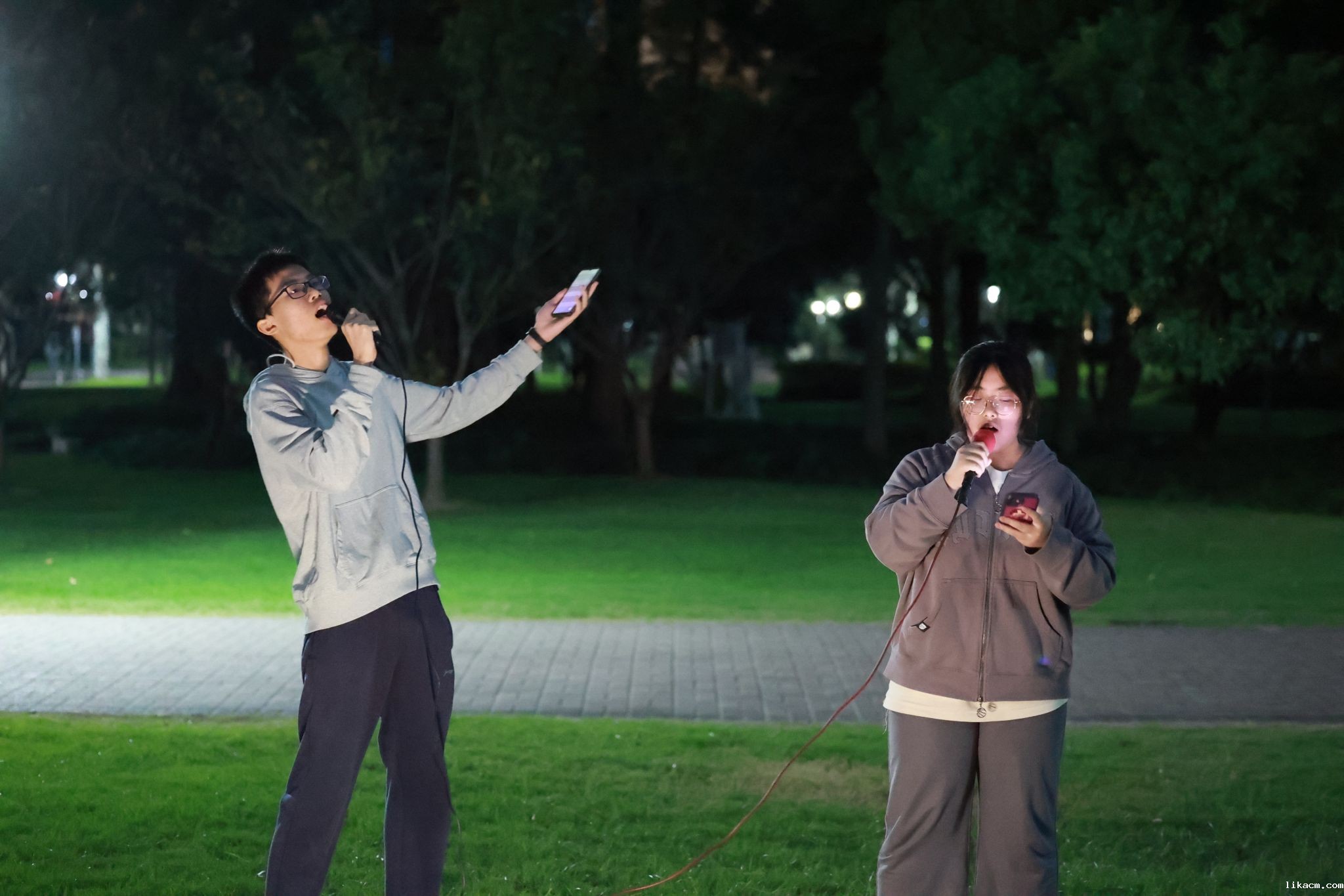 下半场更有26届的学长加入演出,在繁忙学业中借音乐传递轻松与力量。随着天色渐暗,同学们纷纷领取并点亮发光手环。静谧的校园夜色中,点点光芒闪烁,映照出这个夜晚独有的绚烂。