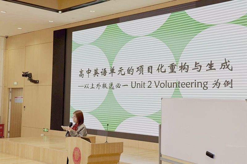 李萍老师攻关计划团队成员胡沐、吴卉梦老师以《高中英语单元的项目化重构与生成 —— 以上外版选必一Unit 2 Volunteering为例》为题,汇报单元顶层设计思路,进行了学情分析,阐述了项目化重构框架。