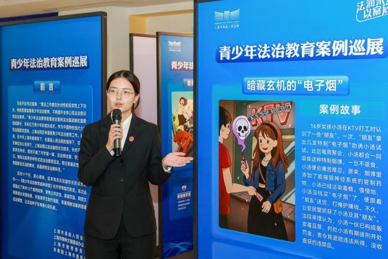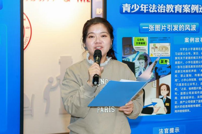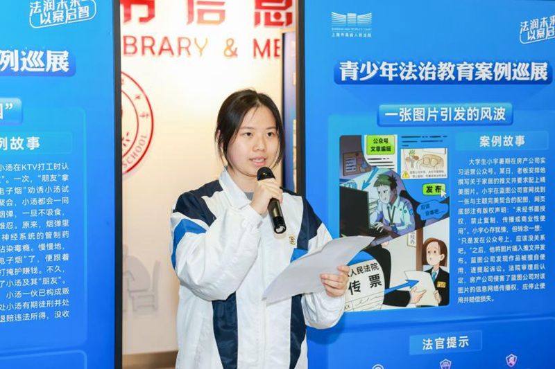 随后,法官助理王茹雪老师向同学们开展了青少年法治教育案例巡展解读。王老师通过对暗藏玄机的“电子烟”、闯红灯引发的悲剧、绿茵场上的意外等十二则案例故事的解读,明确行为边界,为同学们提供了帮助保护自己的“法治锦囊”,传递着规则背后“与人为善”的底色。王老师介绍道,在“法治副校长丛书”中,有更多与《未成年人保护法》相关的案例汇编,鼓励同学们通过阅读丛书了解更多法律案例,从而对于中国特色社会主义法律体系产生更多新的体会。