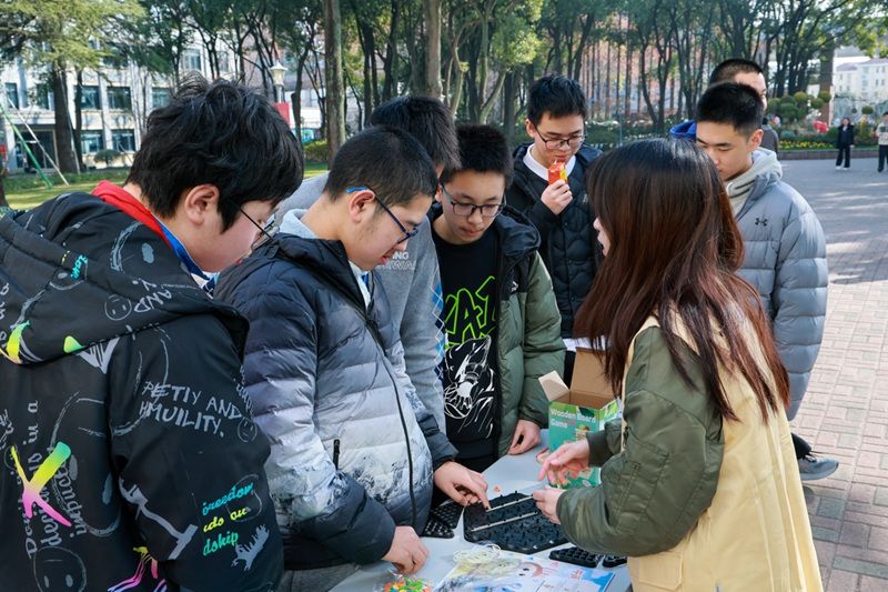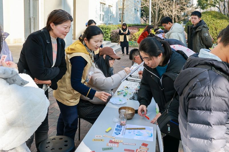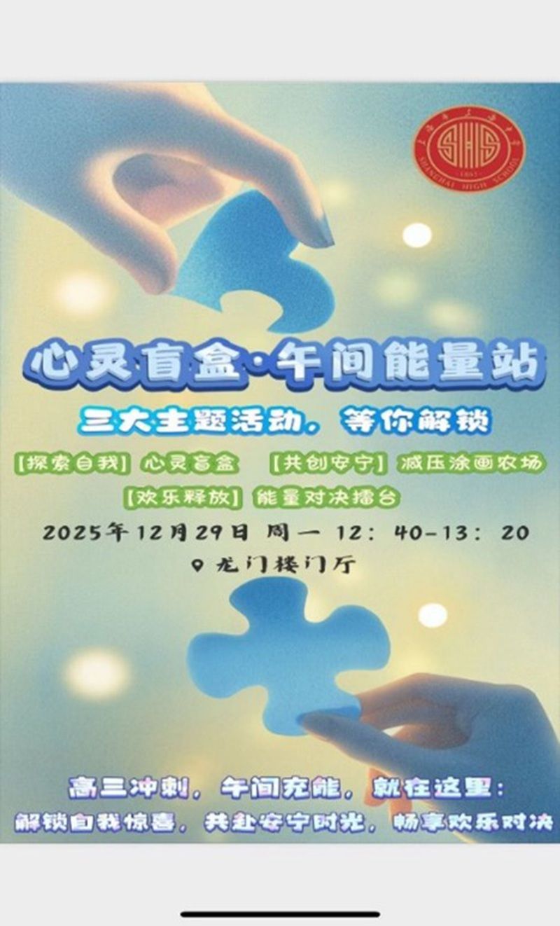 2025年12月29日午间,由学校心理教研组精心策划的“心灵盲盒·午间能量站”心理赋能活动在龙门楼前开展,为高三学子提供了一次别开生面的心灵SPA。学校党委书记张泽红老师、德育处副主任吴静怡老师来到现场与同学们共同参与活动。