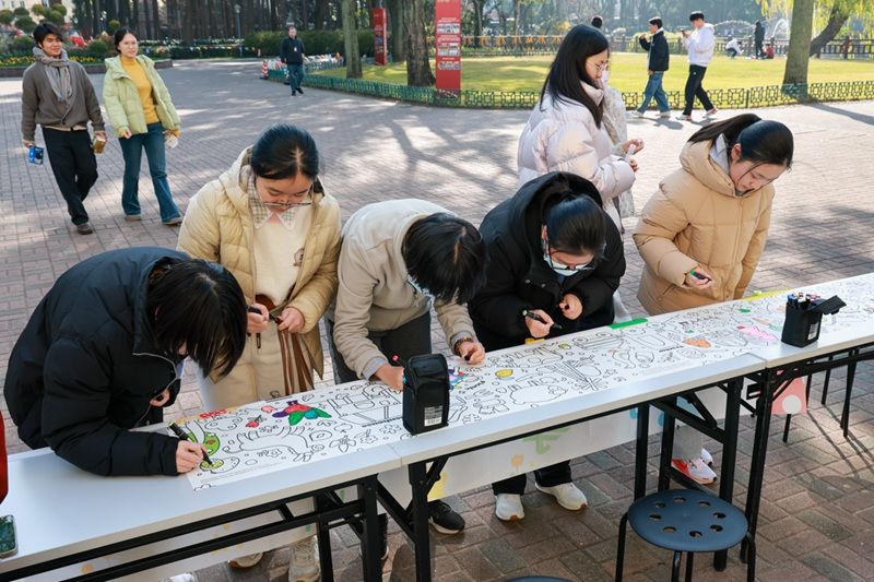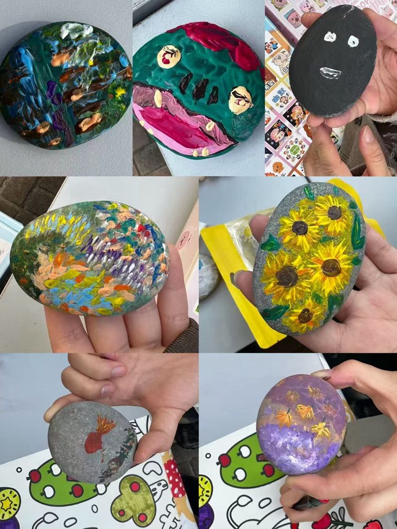 共绘“减压农场”,在协同创作中安顿心神。在“减压涂画农场”区域,同学们或独自沉浸,或三两合作,用彩色画笔为巨幅农场填充色彩、增添创意:飞起的一头牛、花样斑马……笔尖流淌的不仅是色彩,更是当下的宁静与专注。一旁提供的数字油画、石头彩绘等多样选择,让每位同学都能找到适合自己的艺术表达。这幅由众人接力完成的“心灵画卷”,不仅是集体创作的成果,更是紧张备考时光中一片安顿心灵的绿洲。