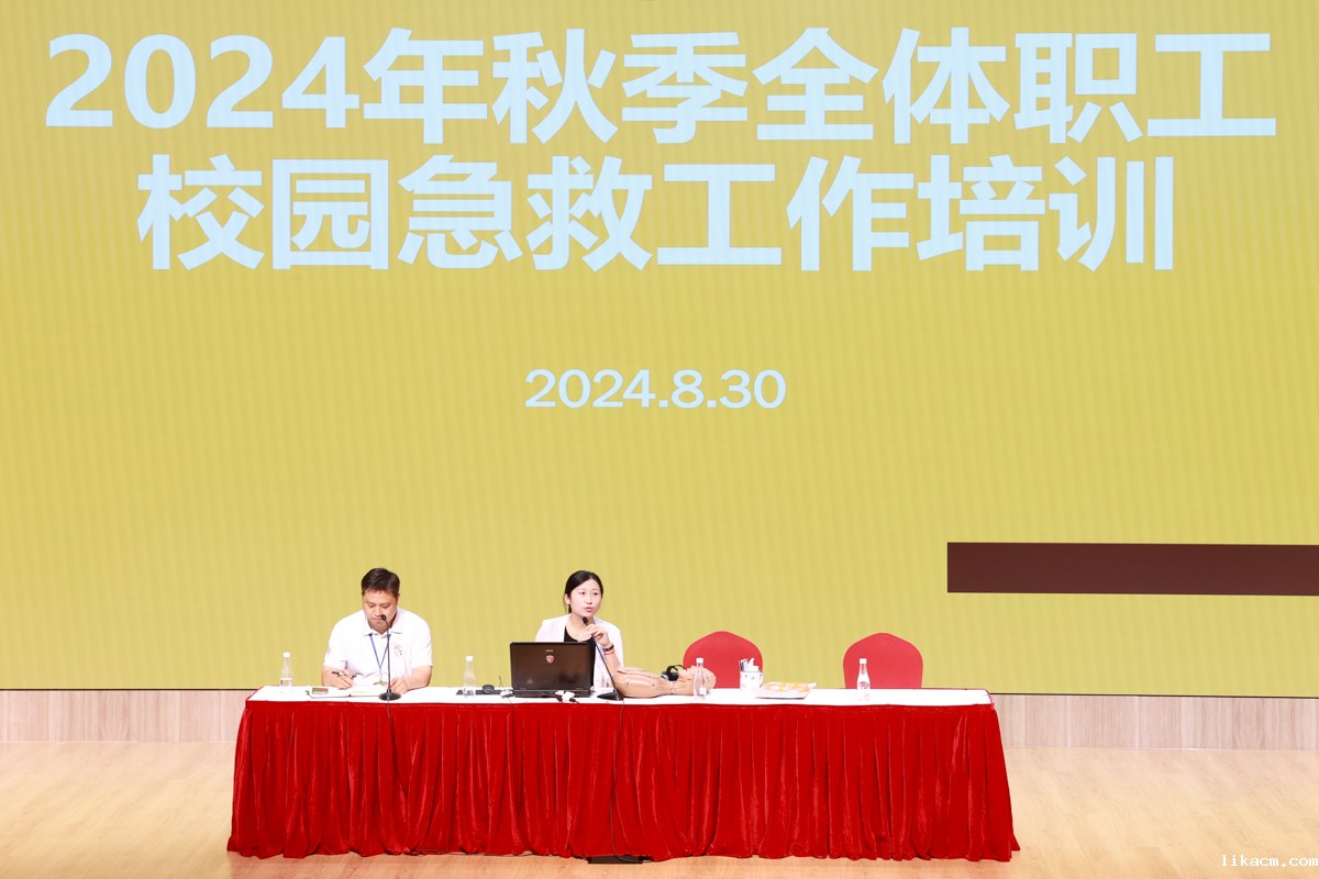 总务处副主任全婵兰医生为全体职工做校园急救工作培训。培训主要分为校园救护和校园健康消毒两部分。她介绍了AED存放点与使用方法、现场救护原则、海姆立克急救法和消毒要求等相关内容,并在现场进行演示。职工们在会议结束后分小组进行急救实操演练。