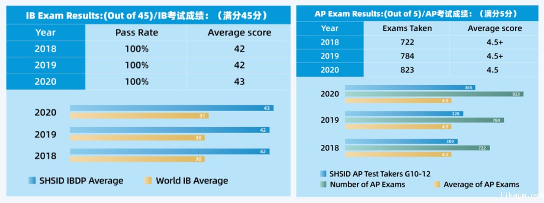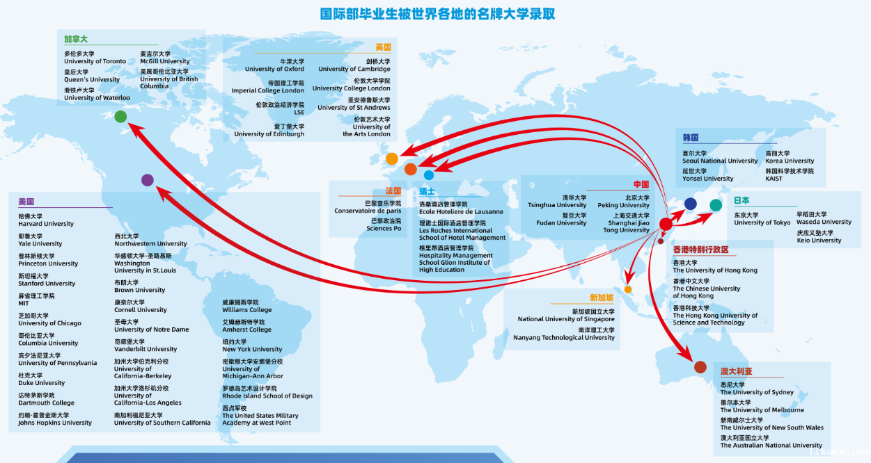 上中国际部注重融通中外、扎根中国办优质国际教育,成为国内乃至国际同类学校的佼佼者。学校先后被授权开设TOEFL\GRE\SAT\PSAT\PACT\ACT\A-LEVEL考点。国际部主要开设类美国课程、国际文凭IB课程、AP课程和A-Level课程等国际通行课程。学校大学先修AP课程开设 21门,IB课程开设 29门。AP课程学科平均分4.5以上(满分5分),IBDP课程总分平均分42分以上(满分45分),处于全球领先水平。国际部毕业生超过95%被国外著名大学录取;每年有约50%的国际部毕业生选择前往美国就读,一批学生被哈佛、耶鲁、普林斯顿、麻省理工学院等顶尖名校录取。