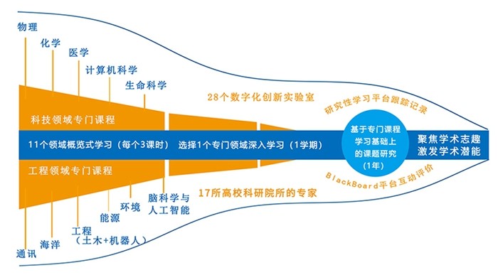 与学校创新实验课程实施匹配,率先构建、持续更新、现在使用的28个现代数字化创新实验室,与17所高校与科研院所、企业合作推进不同领域人才培育的多样导师制形态,促进了学生基于学术志趣引领的潜能开发。其中,与上海交通大学等推进的实验班与实验组课程,与复旦大学开展的“学术志趣与创新素养培育的导师制计划”,持久拓展学术知识领域,激发学术志趣潜能,让学校持续走在高水平人才培养体系视野下大中学合作育人新路上(获全国基础教育教学成果奖二等奖),成为新时代高校“强基”计划向中学延伸的探索先锋。每年学生进入北大、清华、复旦、交大等同级别高校超过70%,进入“双一流”高校超过99%。